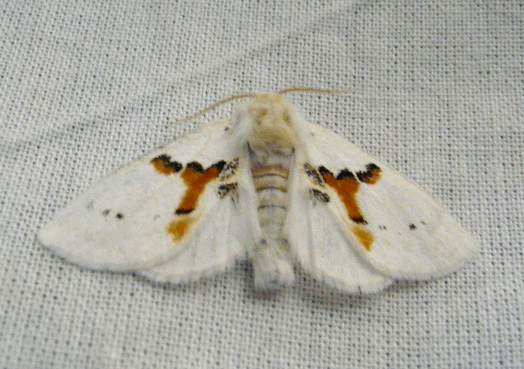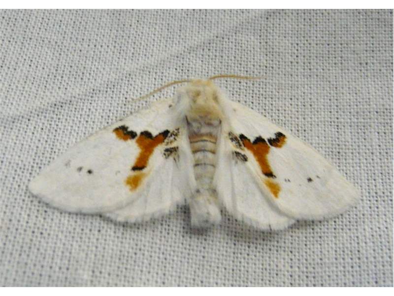 Die Falter sind schneeweiß und tragen auf dem Vorderflügel ein orangebraunes Y-förmiges Zeichnungselement, das sowohl zum Kopf als auch zum Hinterleibsende hin von einer dünnen schwarzen Linie eingefasst ist. Seitlich des Y nahe dem Flügelrand befinden sich zwei orangebraune Flecken, die ebenfalls anterior von einer schwarzen Linie begrenzt sind. Posterior des Y-Zeichens befindet sich häufig ein orangegelber Fleck.