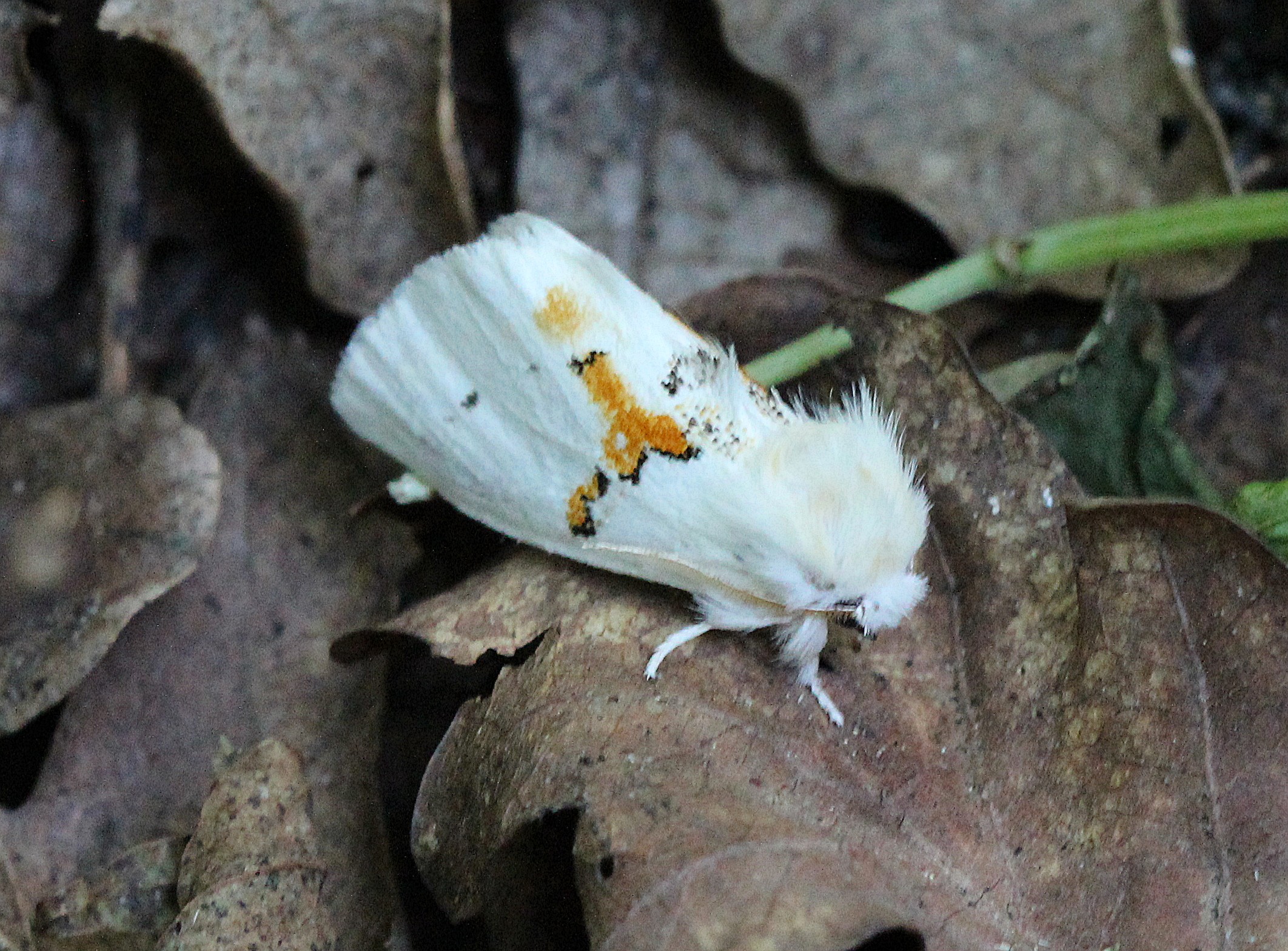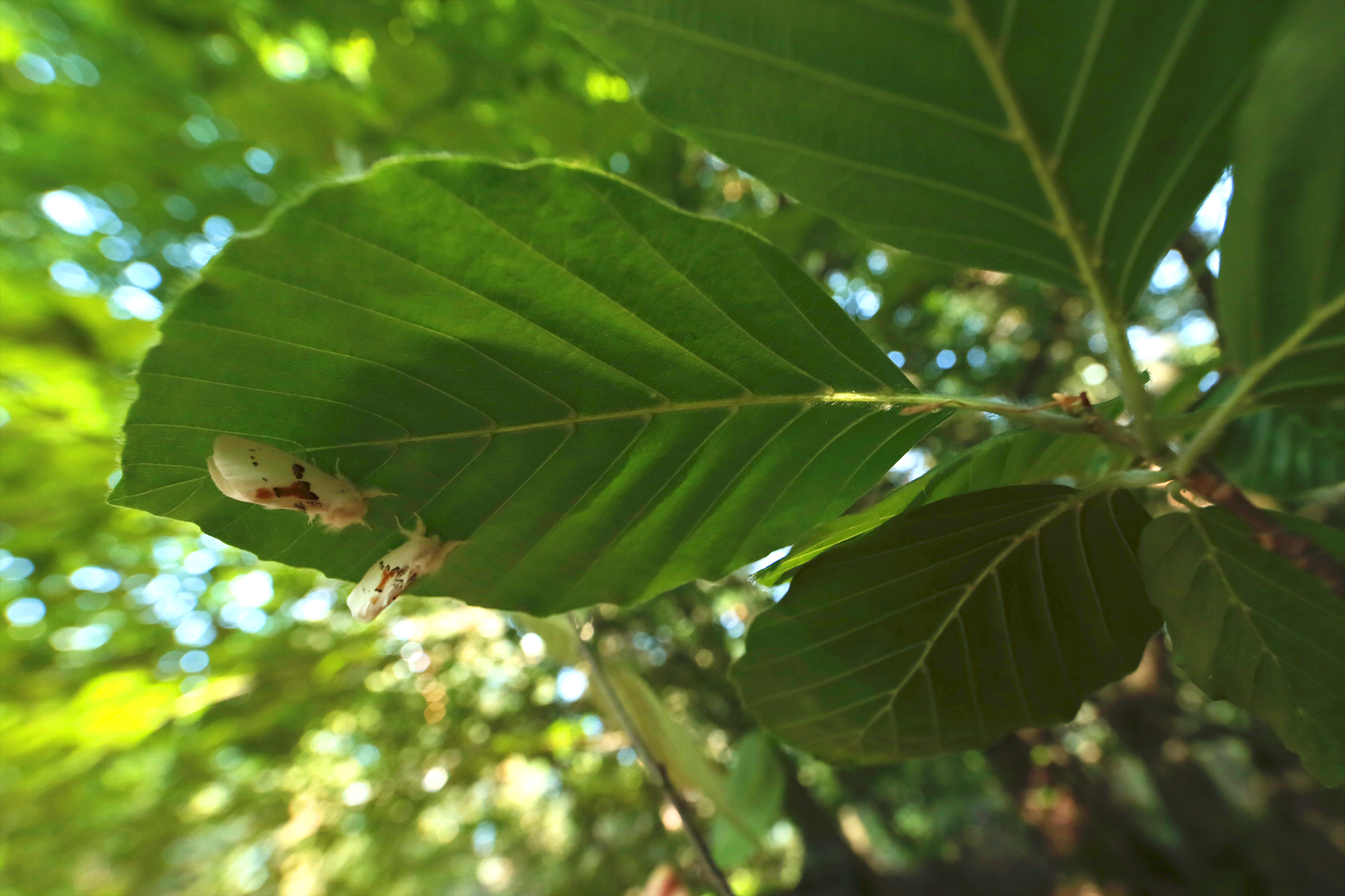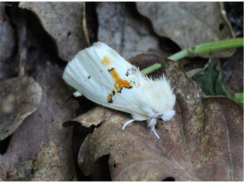 Schneeweißer Zahnspinner (Leucodonta bicoloria) 2 Exemplare,; gefunden in altem Laubwaldbestand des Bockwitz Waldes bei Borna LK Leipzig zwischen Eichenblättern unterm Baum, Juli 2014