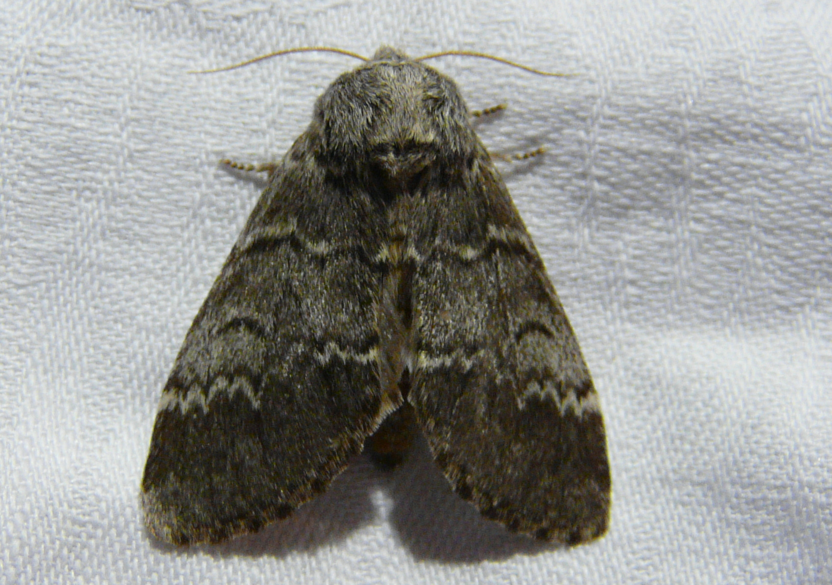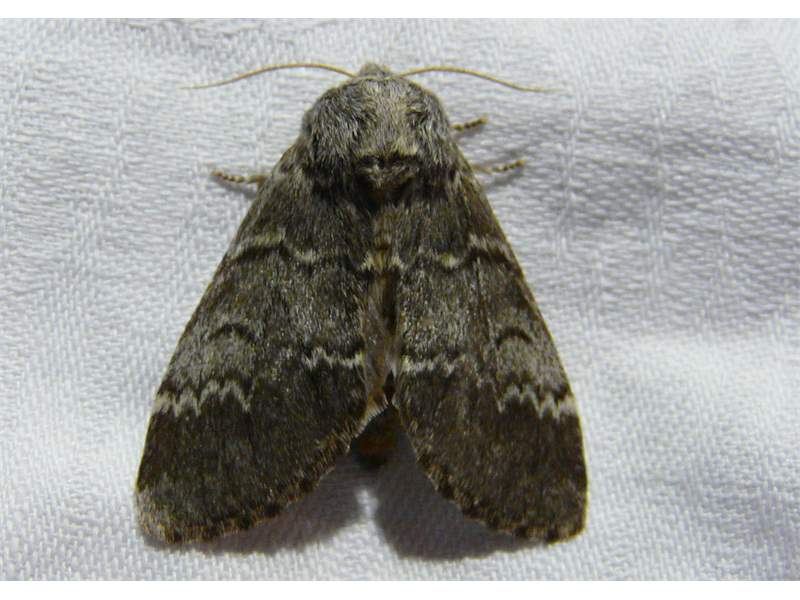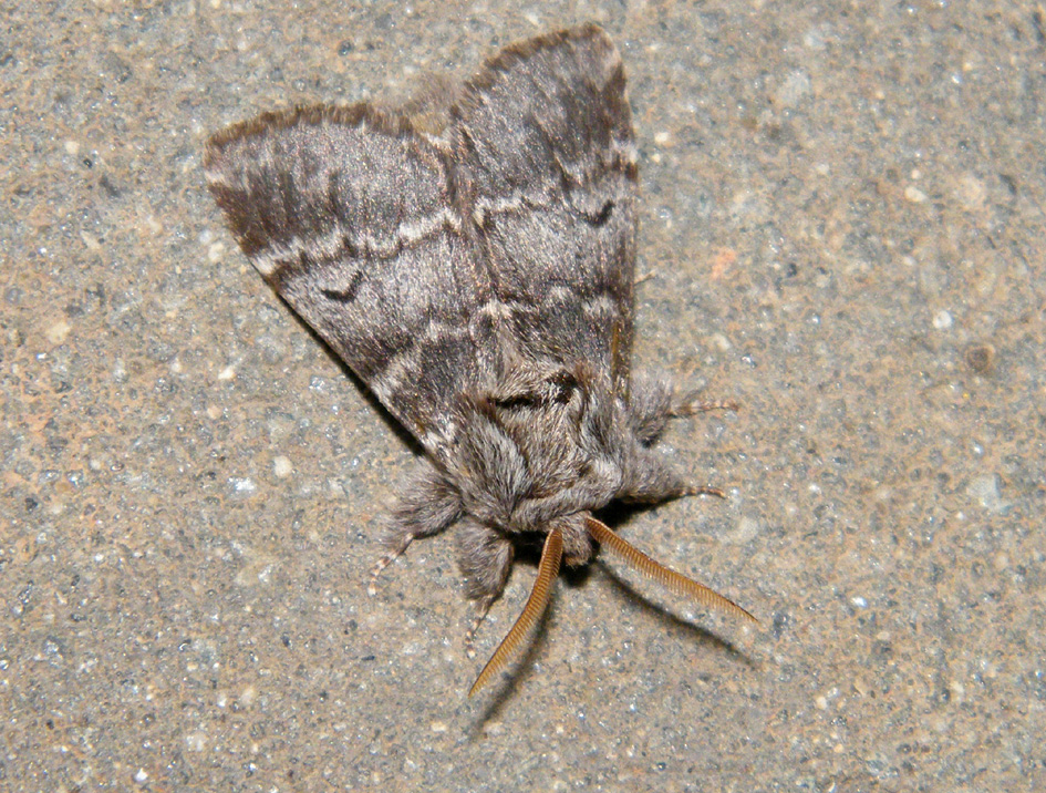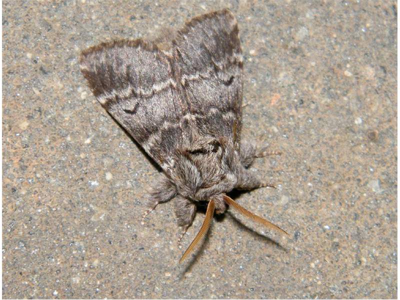 Grundfarbe grau, auf dem Vorderflügel zwei weiße, gezackte Linien, zwischen denen das Grau posterior oft etwas aufgehellt ist. Zwischen diesen beiden Linien befindet sich ein kleines schwarzes, dachförmiges Zeichungselement. Antennen orangebraun, beim ♂ auffällig gefiedert, beim ♀ fadenförmig.