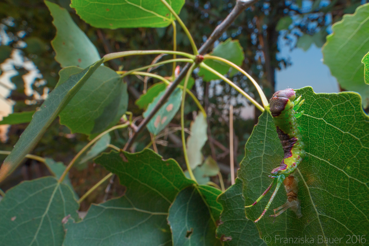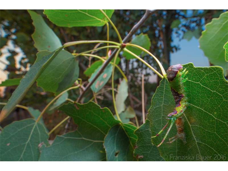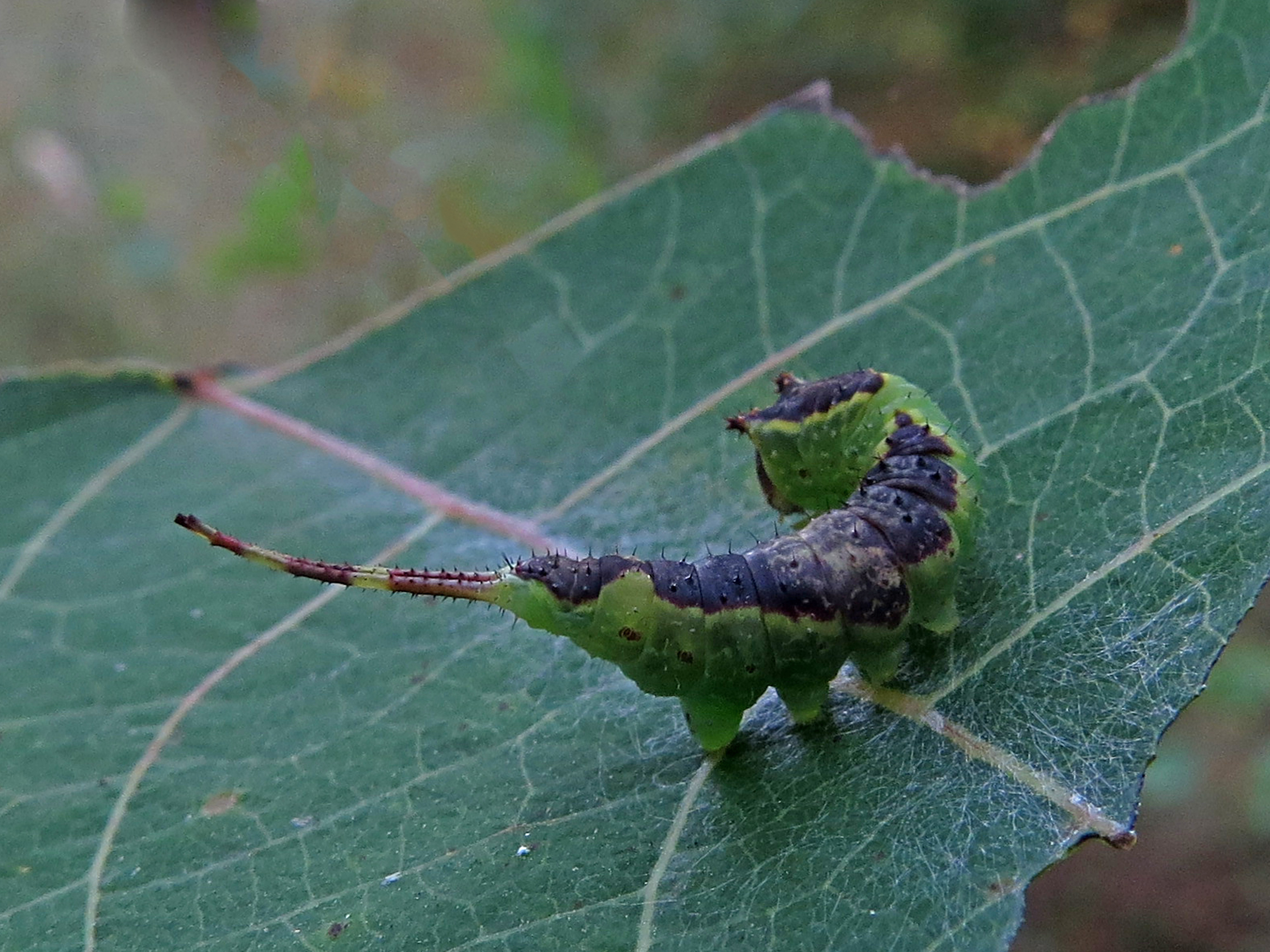 Larve des Kleinen Gabelschwanzes am Blatt einer Zitterpappel, Hochhalde Trages bei Espenhain, Anfang September 2016