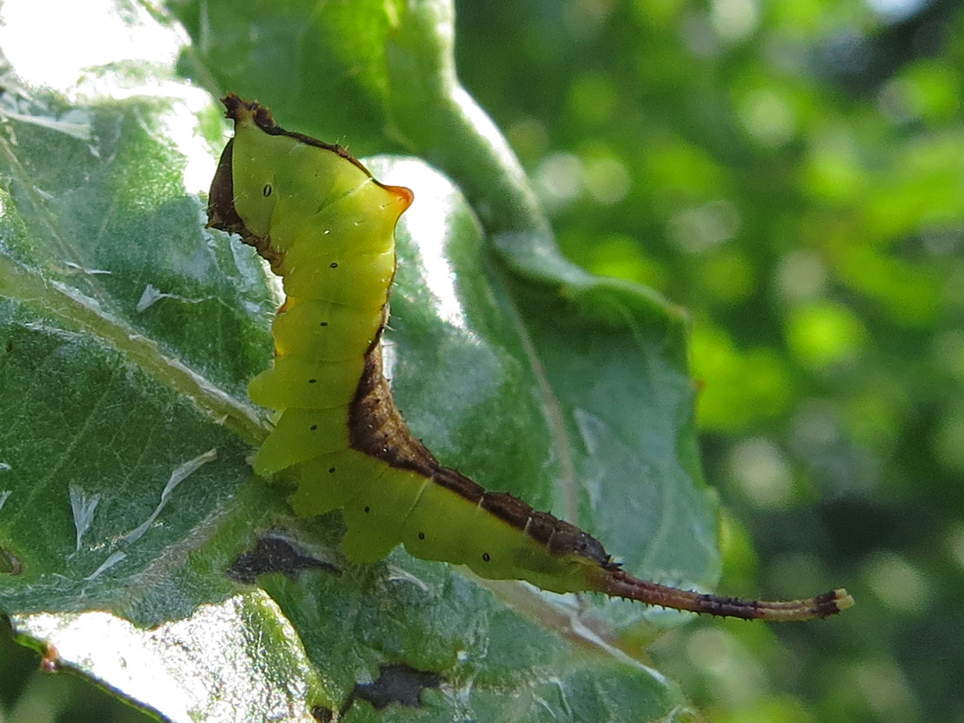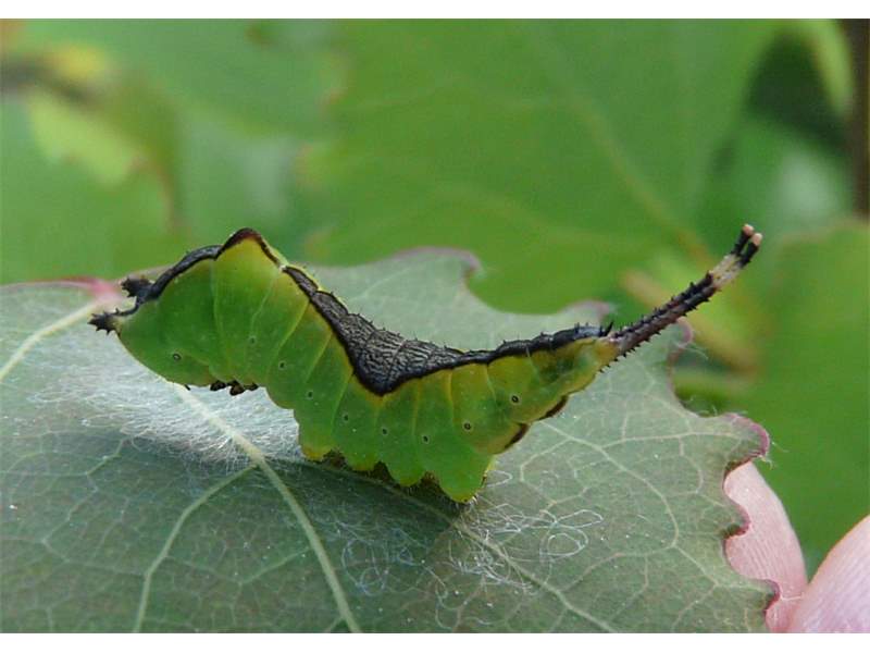 Die Raupe wird bis zu 80 mm lang und ist damit die größte aller Gabelschwanz-Arten (Cerura erminea, Furcula-Arten). Sie ist hellgrün und besitzt auf dem Rücken des dritten Abdominalsegments einen Höcker mit roter Spitze. Der Nachschieber ist zu einer "Gabel" umfunktioniert, die schwarz gekörnt ist und aus der bei Abwehrverhalten zwei dünne rote Schläuche ausgestülpt werden können. Vom Halsschild bis zum letzten Abdominalsegment erstreckt sich ein weißgesäumter, dunkelgrauer, dunkelgrüner oder weinroter Rückenstreifen mit feinen hellen Längsstrichen. Der Rückenstreifen ist auf Höhe des zweiten und dritten Bauchbeinpaares etwas verbreitert. Über dem zweiten Bauchbeinpaar befindet sich bisweilen ein dunkelgrauer, weißgesäumter Fleck. Auf dem ersten Segment besitzt sie um den Kopf herum einen leuchtend roten Ring, der erst gegen Ende der Larvalentwicklung zum Vorschein kommt. Auf diesem roten Ring befindet sich oberhalb des Kopfes auf jeder Seite jeweils ein großer schwarzer Punkt. Die Kopfkapsel ist braun und beiderseits mit jeweils einem schwarzen Streifen versehen, der sich von den Augen bis zur Oberkante des Kopfes zieht. Vor der Verpuppung verfärbt sich die Raupe erst dunkelgrün und dann weinrot.