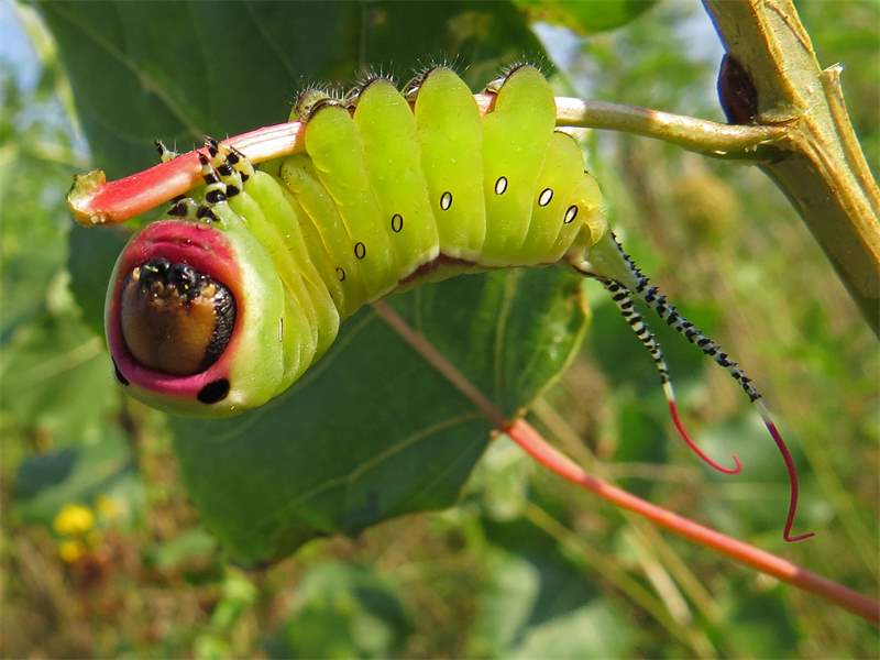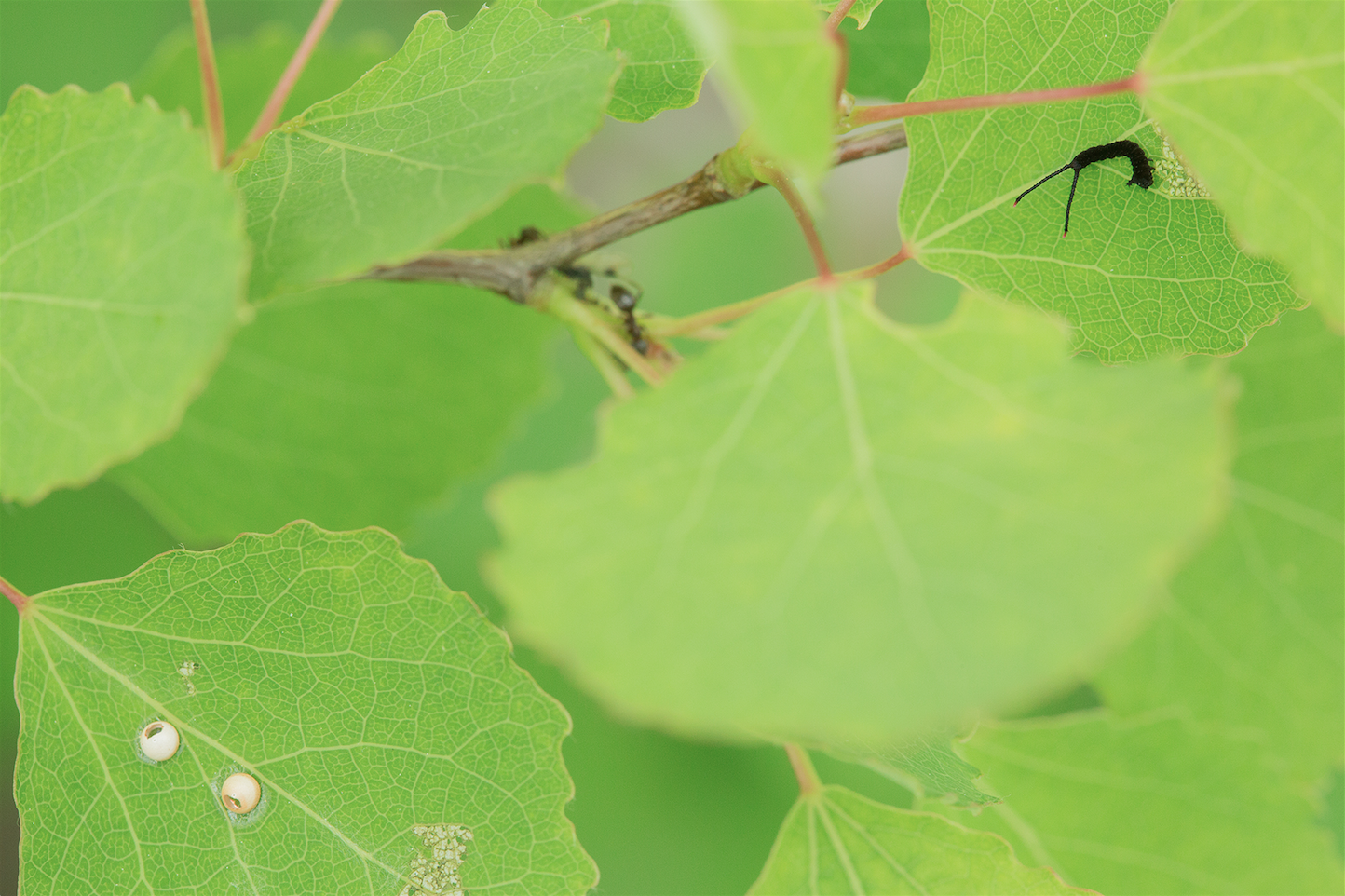 Die Weibchen legen ihre Eier einzeln oder in kleinen Gruppen mit bis zu 6 Eiern auf der Blattoberseite knie- bis mannshoher Pappel- oder Weidenbäumchen ab. Bevorzugt werden Zitter- und Schwarzpappel (Populus tremula, P. nigra), sowie Salweide (Salix caprea). Die Raupen sitzen bis zum vorletzten Larvalstadium auf der Blattoberseite auf einem dünnen, flächigen Seidengespinst. Werden sie im letzten Stadium zu groß und schwer, klammern sich bevorzugt an Blattstiele oder dünne Zweige. Im ersten Larvalstadium skelettiert die Raupe die Blattoberseite, in den folgenden Stadien beißt sie dann vollständige Blattteile von der Blattspitze beginnend ab. Bei Gefahr zeigt sie ein bemerkenswertes Abwehrverhalten: Sie zieht den Kopf ein und dreht ihn einwärts, sodass der leuchtend rote Ring mit den schwarzen Augenflecken um den Kopf herum deutlich zum Vorschein kommen. Zugleich biegt sie ihr Hinterende kopfwärts nach oben, spreizt die Gabelschwänze am Hinterende und stülpt aus ihnen kleine, um sich schlagende rote Schläuche. Zusätzlich ist sie befähigt, aus speziellen Drüsen am ersten Brustsegment Ameisensäure 20–30 cm weit zu spritzen.