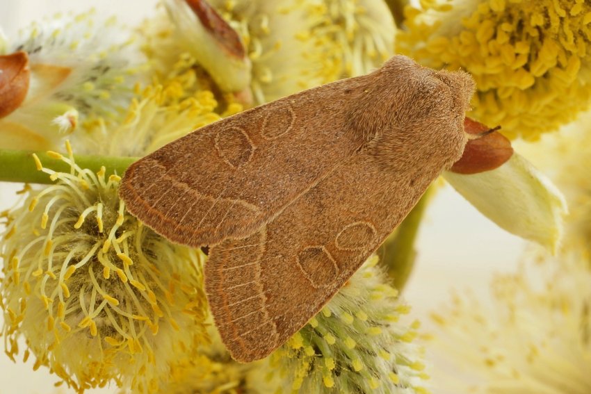 Vorderflügeloberseite: Grundfarbe sehr variabel von dunkelrotbraun bis beige, manchmal mit grauen Einmischungen, aber nie einfarbig grau. Ring- und Nierenmakel auffällig groß, hell gerandet und eng beieinander stehend. Ringmakelfüllung wie Grundfarbe, Nierenmakel im unteren Bereich meist dunkler gefüllt. Zapfenmakel (wenn sichtbar) hell gerandet und auch ziemlich groß. Mittelschatten dunkel und zumindest andeutungsweise vorhanden. Beide Querlinien meist nur schwach entwickelt. Im Bereich der äußeren Querlinie entspringen deutliche helle Aderstriche, die die Wellenlinie durchschneiden und erst am Flügelrand enden. Am Beginn dieser hellen Striche können sich bei einzelnen Faltern dunkle Punkte befinden. Helle Wellenlinie innen zum großen Teil strichförmig dunkel begrenzt, verläuft leicht geschwungen bis gerade.