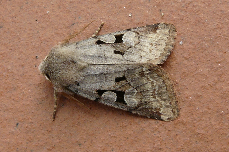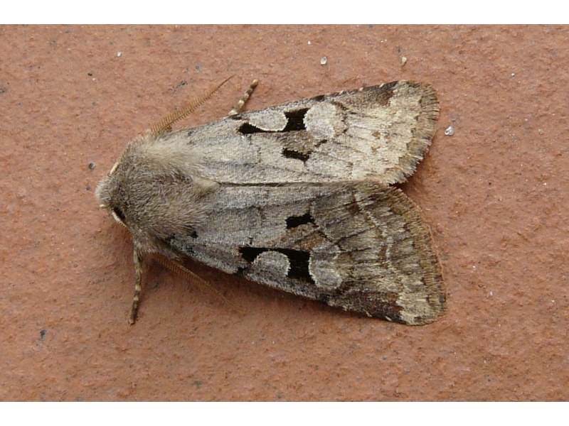 Vorderflügeloberseite: Grundfarbe violettgrau bis braungrau, ein schwarzer c-förmigen Fleck begrenzt die helle Ringmakel in Richtung Flügelmitte, der hellere Farbton der Ringmakelfüllung setzt sich auf der gesamten Länge des schwarzen Fleckes bis zum Vorderrand fort. Saumwärts schließt sich an den schwarzen Fleck die hell umrandete Nierenmakel an. Beide Querlinien hell, zum Mittelfeld hin dunkel angelegt. Von der äußeren Querlinie nach innen ein schwarzer Strich, der nicht bis zur inneren Querlinie reicht. Wellenlinie hell, leicht geschwungen und gezackt.