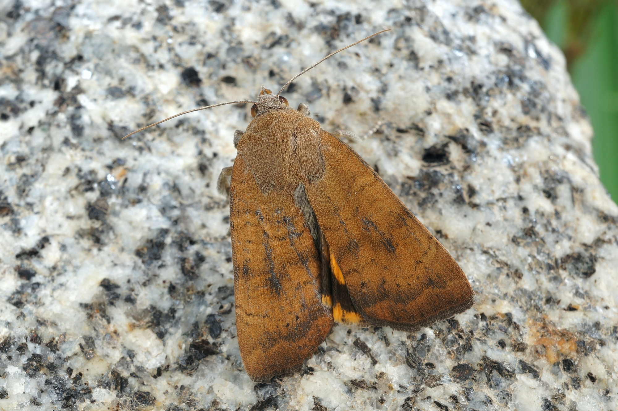 Vorderflügeloberseite: Grundfarbe rot- bis lederbraun. Querlinien doppelt angelegt, Zwischenraum wie Grundfarbe, keine dunklen Flecken am Beginn der Querlinien. Helle Wellenlinie innen dunkel angelegt, Saumbereich verdunkelt. Mittelschatten, unterer Bereich der Nierenmakel und ein Fleck unterhalb der Ringmakel dunkler als die Umgebung. Makeln schwach dunkel umrandet, Füllung entspricht (außer im unteren Teil der Nierenmakel) fast der Grundfarbe, deshalb oft kaum erkennbar.