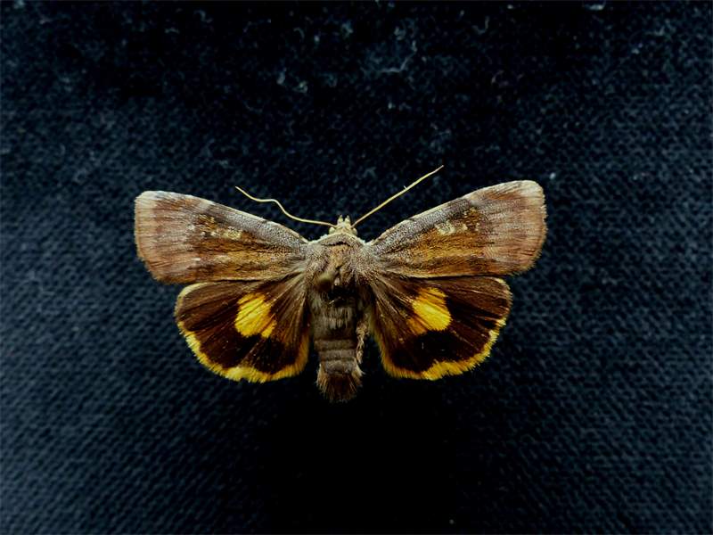 Hinterflügel: Dunkel beschuppte Basis, gelbe bis dunkelgelbe Flügelmitte, breite schwarze Randbinde mündet schräg auf den Vorderrand, schwarze Beschuppung zieht sich von dort bis zur Flügelbasis hin.