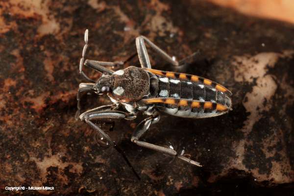 Velia saulii, Weibchen. Auf dem Bild ist die konvex verlaufende Rückenkante, die am Körperende abfällt, gut zu erkennen. Chemnitz-Draisdorf, Chemnitzaue, Bach unterhalb der Draisdorfer Teiche (Deutschland, Sachsen, Stadt Chemnitz), 21.08.2011