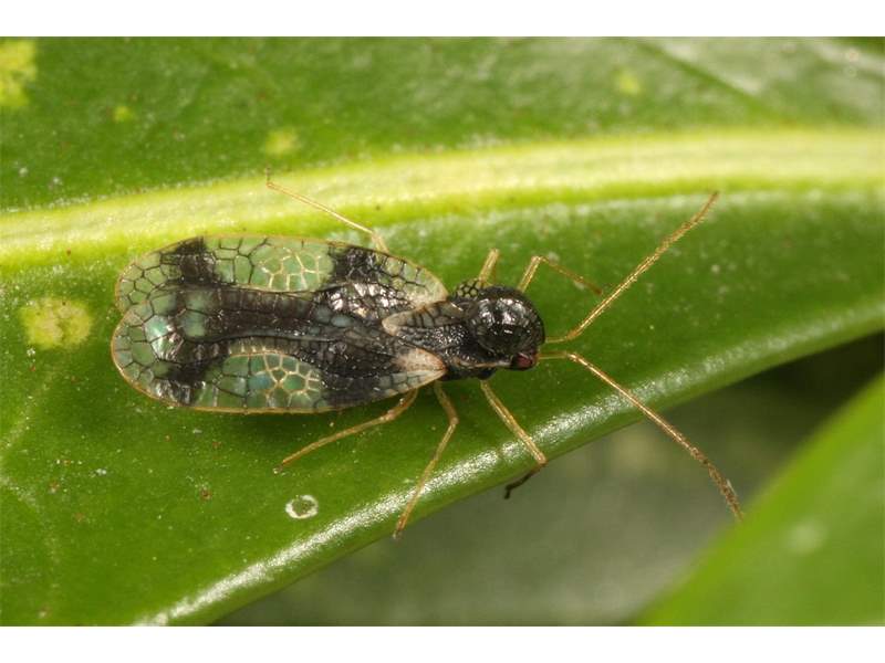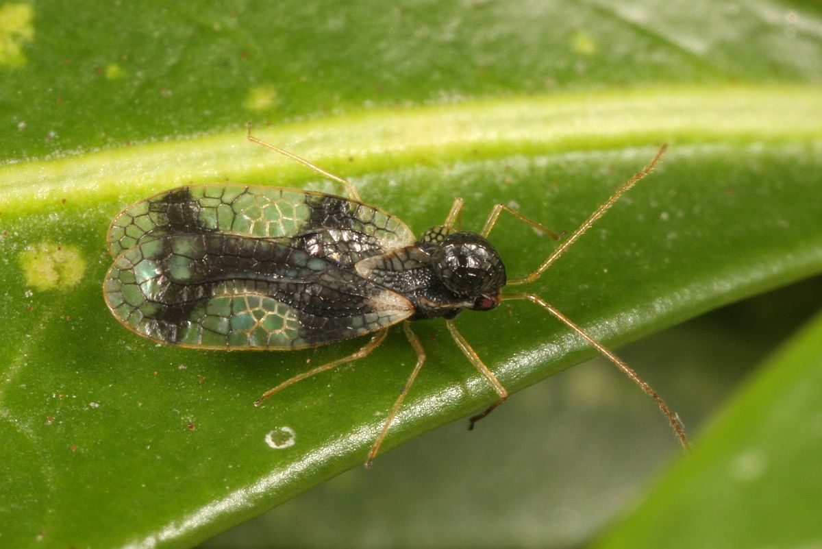 Männchen der Andromeda-Netzwanze (Stephanitis takeyai) auf der Blattoberseite eines nur leicht besaugten Blättchen von Pieris japonica. Chemnitz-Adelsberg (Deutschland, Sachsen, Stadt Chemnitz) im September 2013.