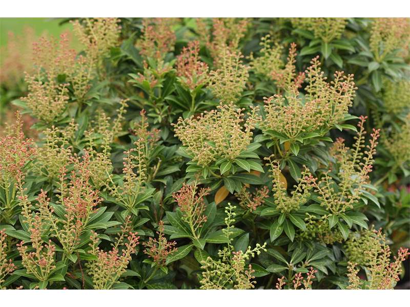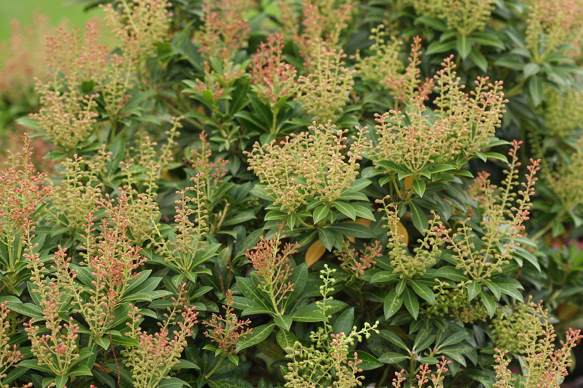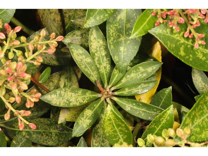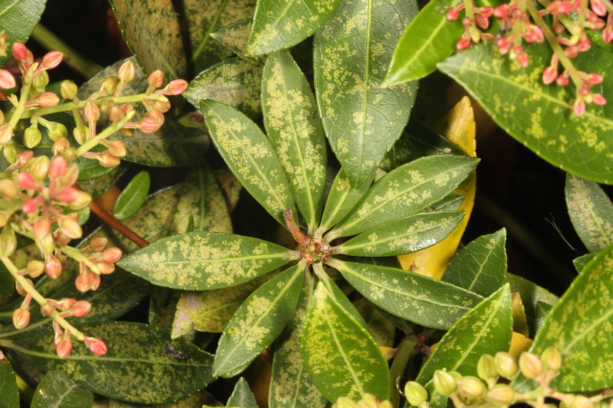 Lavendelheide (Pieris japonica) - die Wirtspflanze der Andromeda-Netzwanze (Stephanitis takeyai). Der Befall ist an inneren Blättern in Form von gelben Saugpunkten gut zu erkennen. Chemnitz-Adelsberg im September 2013.