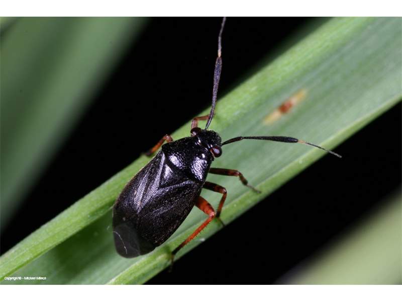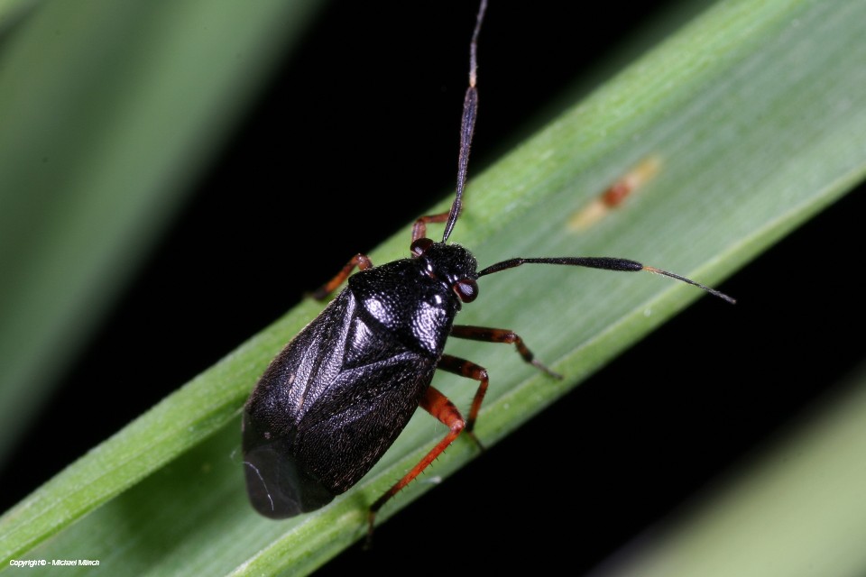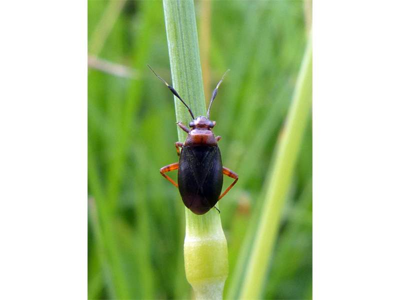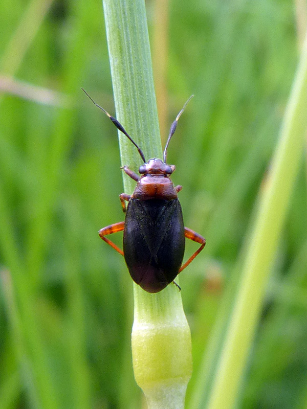 Das am rötlichen Kopf und Halsschild  leicht erkennbare Weibchen von Capsus ater (Linnaeus, 1758) auf einer Streuobstwiese im Vogtland, Juni 2019.