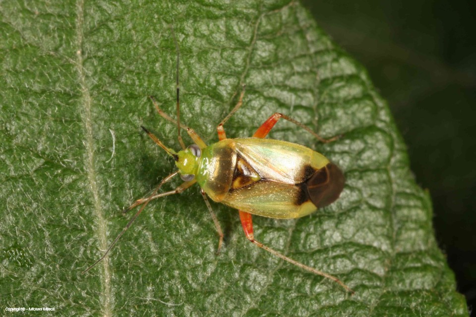 Apolygus limbatus. Gut zu sehen sind die auffälligen roten Hinterschenkel, die A.limbatus von den anderen verwandten Arten gut unterscheidet. Altmannsgrün, Nordost-Teil des Oelsnitzer Gewerbegebietes, gegenüber Strassenabzweig zum Ort auf feuchter gebüschbestandener Brache (Deutschland, Sachsen, Vogtlandkreis), 17.06.2011 (© Michael Münch)( Bild vergrößern)
