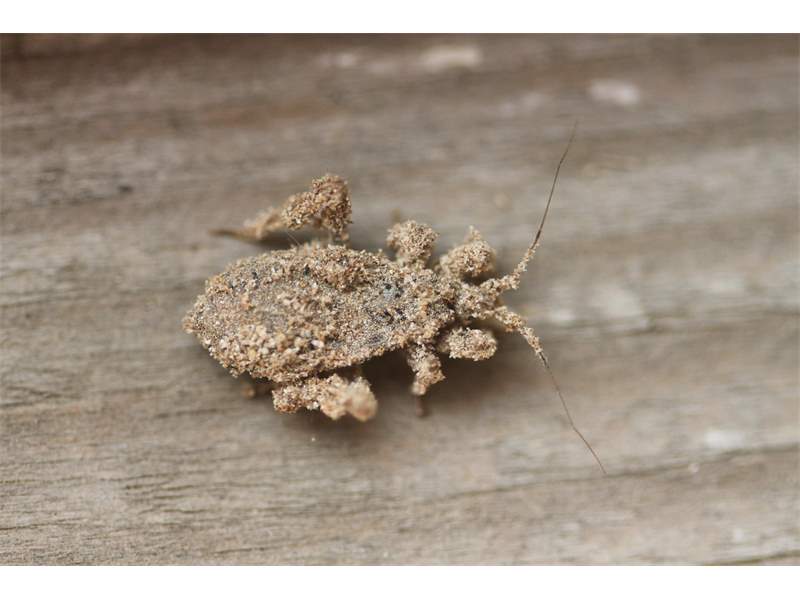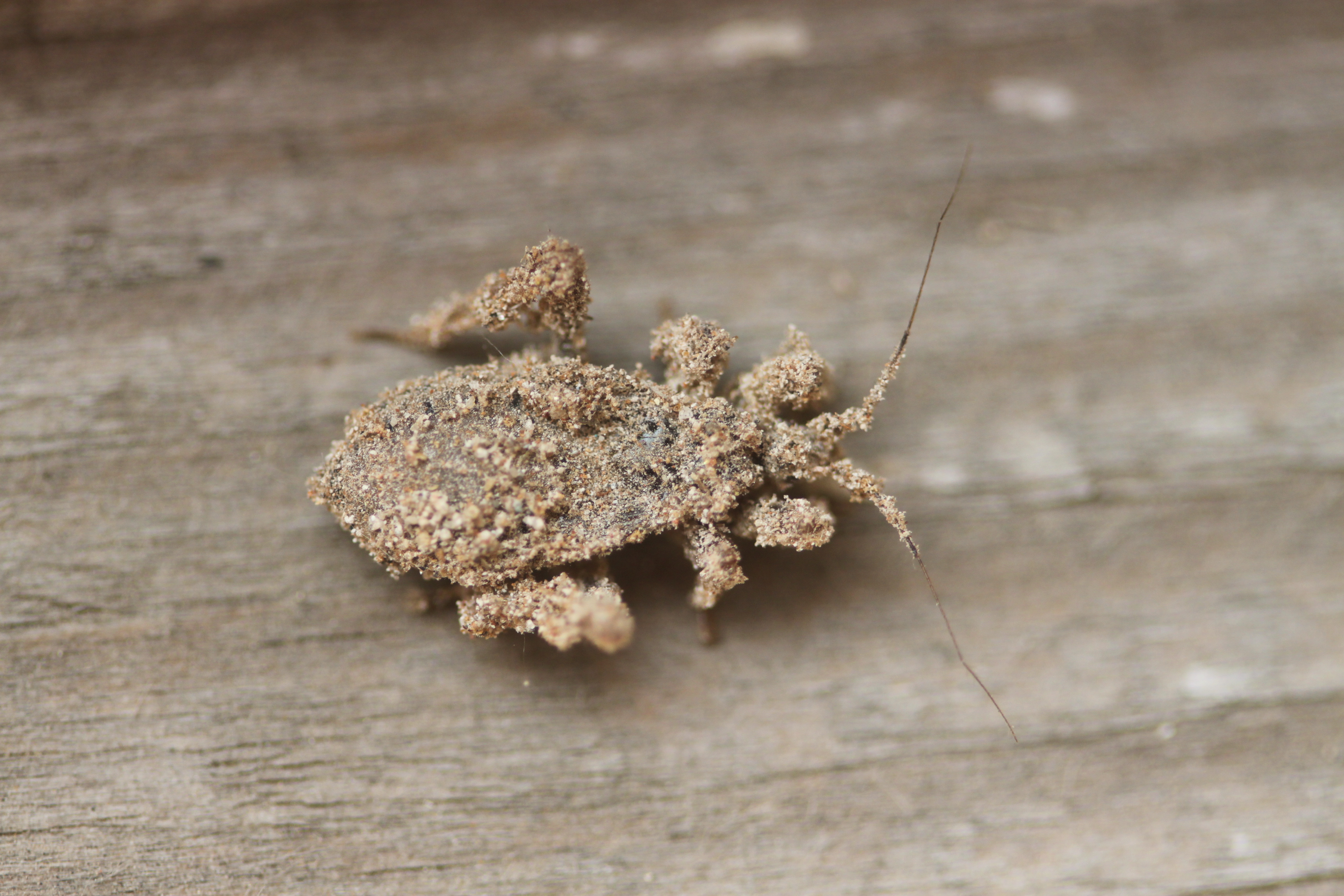 Ein Maskierter Strolch (Reduvius personatus) in typischer Tarntracht. Das Tier umgab sich mit einem Sand-Lehm-Gemisch, welches aus dem Putz eines Abrisshauses in Pirna herausrieselte. Das Tier saß auf der besonnten Fensterbank im Dachgeschoss des Gebäudes. Gefunden im April 2013.