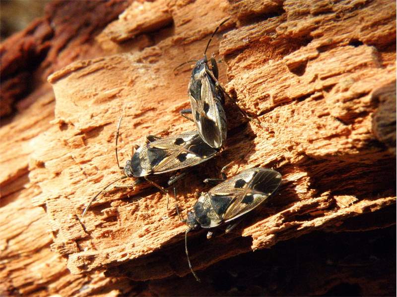 Überwinterungsgemeinschaft von Rhyparochromus vulgaris unter loser Borke und altem Kirschbaumholz. Löbschütz im April 2013.