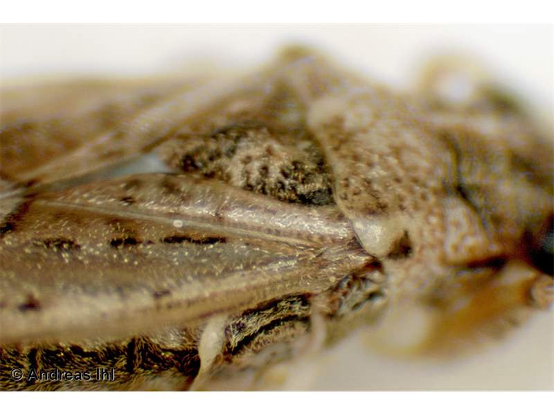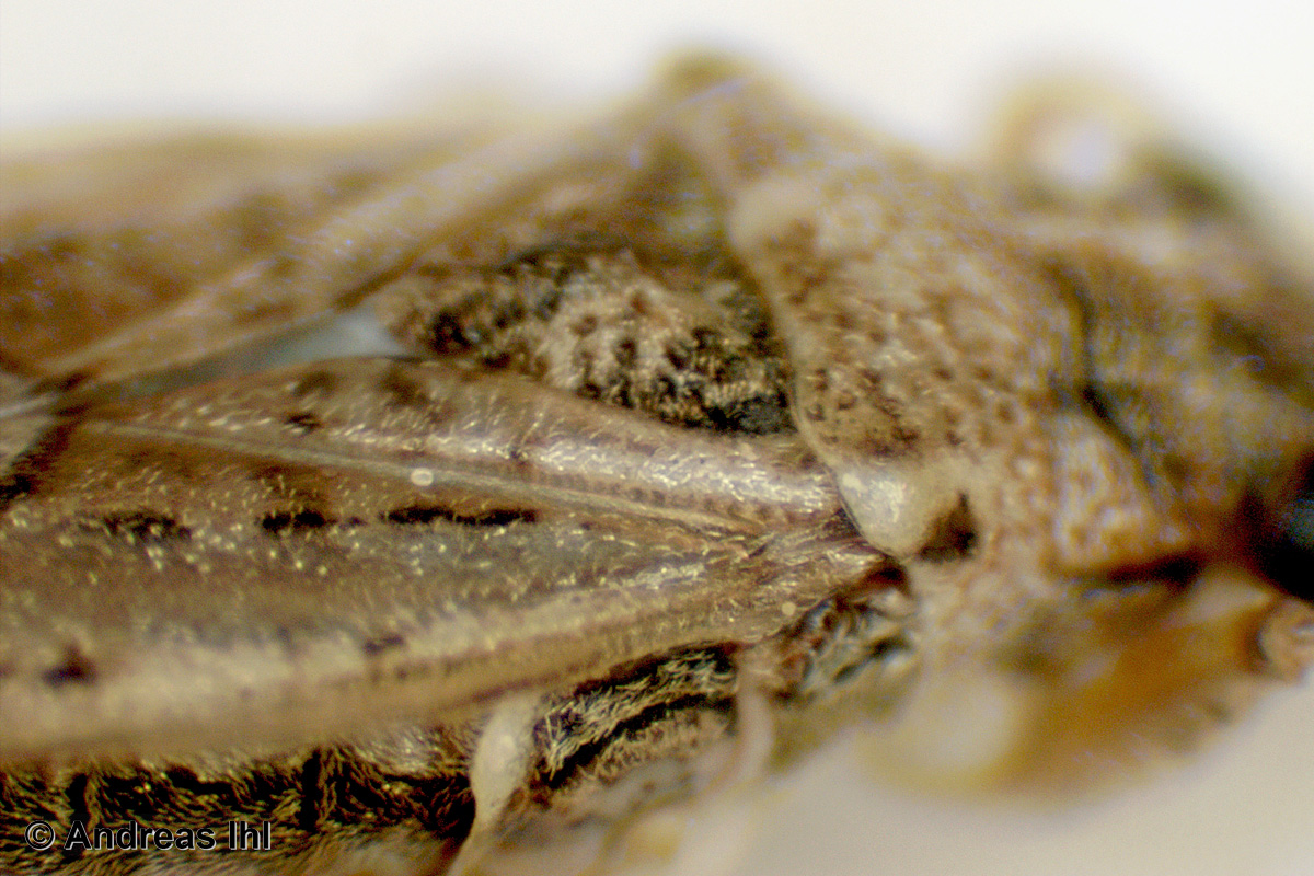 Thorax: Halbdecken weiß-grau, nicht durchscheinend, mit dunklen Flecken auf den Adern, das Abdomen nicht deutlich überragend. Adern der Halbdecken beim Weibchen mit kurzen Haaren, die kürzer sind als der Durchmesser des 2.Fühlergliedes. Schildchen ohne helle Mittellinie. 1. Tarsenglied deutlich länger wie 2. und 3. zusammen.