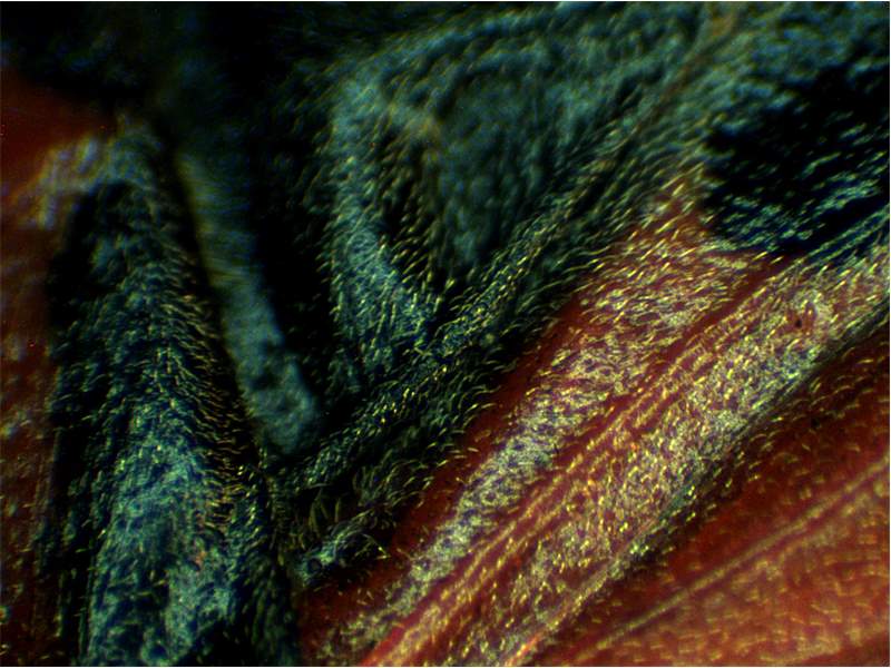 Abdomen: aufrechte längere Haare auf dem Schildchen, markante rote Zeichung mit schwarzer kreuzartiger Zeichnung, Membran schwarz mit weißen Flecken, davon ein aufälliger runder Mittelfleck.