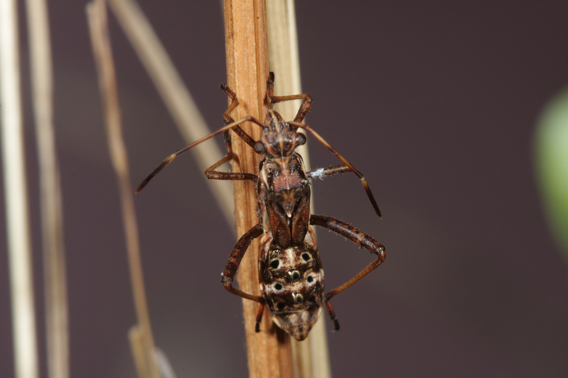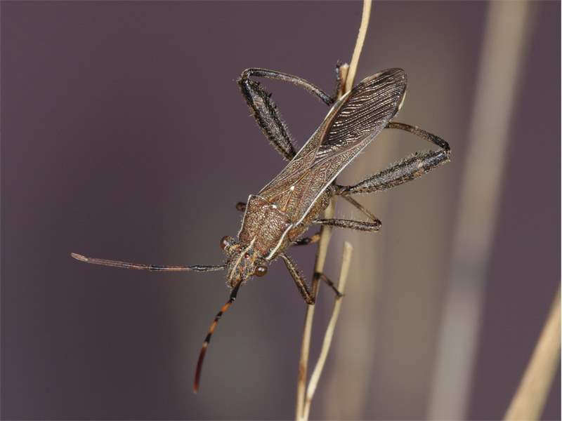 Ähnliche Art: Alydus calcaratus mit geraden Hinterschienen, Kopf mit kleineren nicht aufsitzend platzierten Augen..