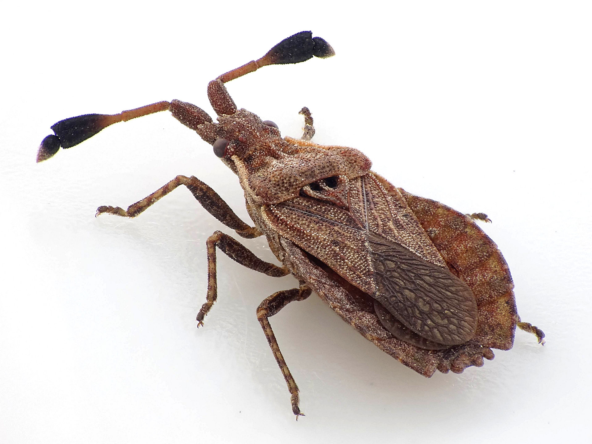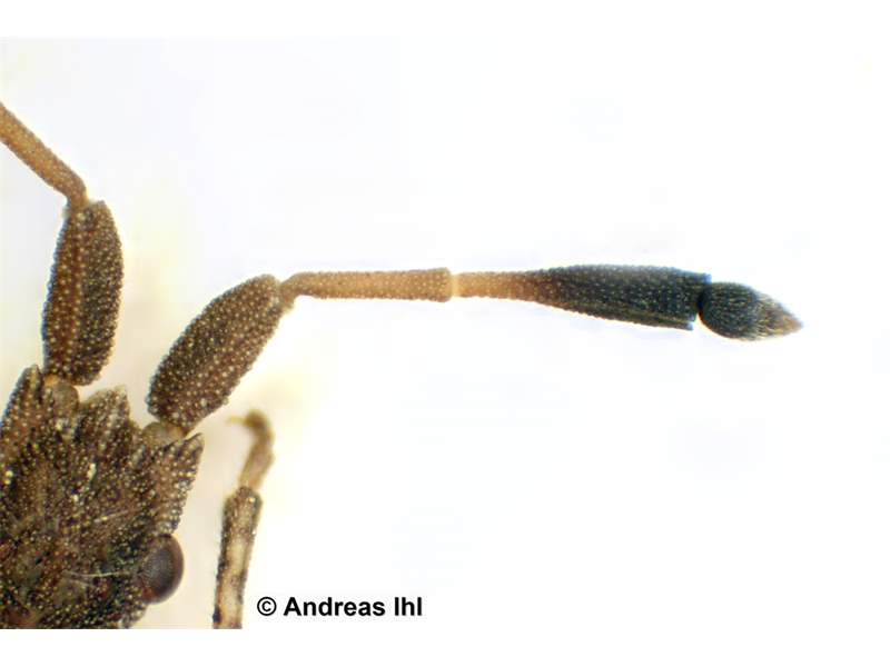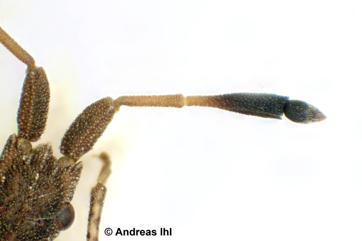 Kopf: rechteckig, je ein Dorn seitlich der Fühlerhöcker und ein Mitteldorn, 3.Fühlerglied ab der Mitte blattartig verbeitert und schwarz gefärbt.
