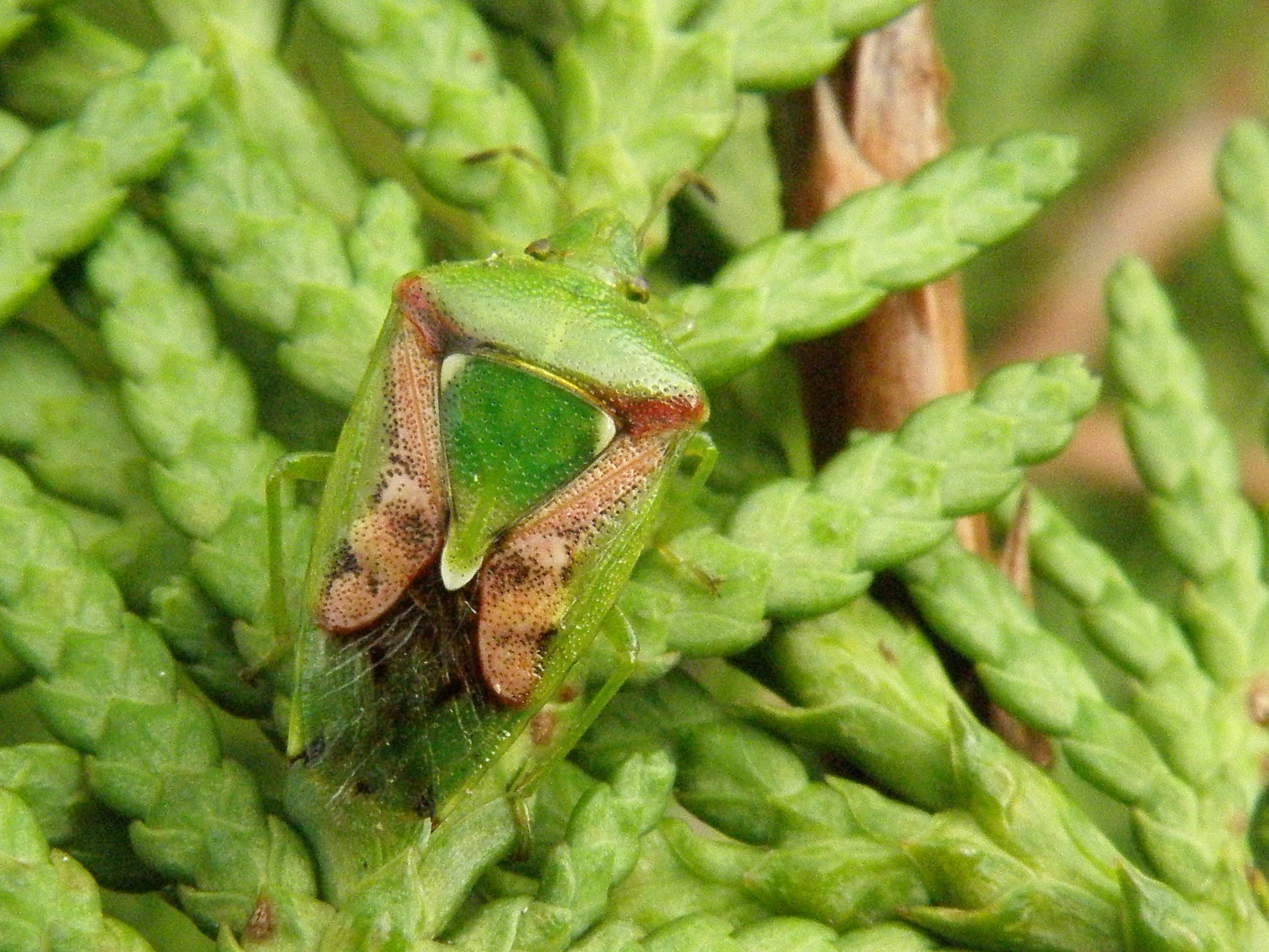 Cyphostethus tristriatus ist ein typischer Bewohner von Wacholder und anderen bei uns angepflanzt vorkommenden Zypressengewächsen.