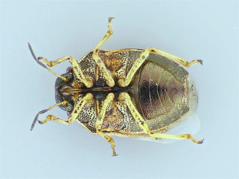 Thorax: Halsschild, Schildchen und Halbdecken hell gelbbräunlich, Membran rauchbraun. Beine hellbräunlich.