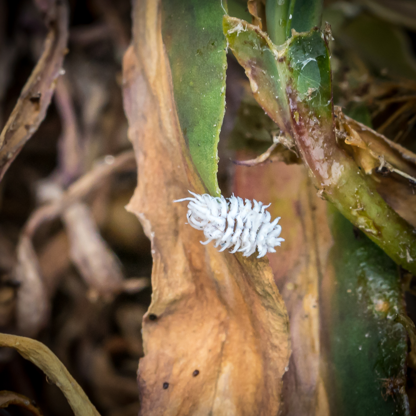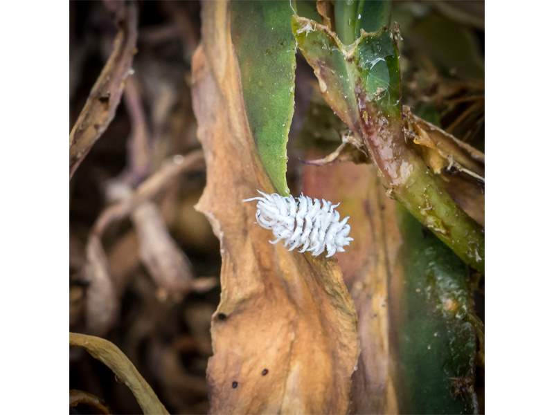 Die Larven werden 14–15 mm lang, haben weiße Wachsausscheidungen und ähneln dadurch der äußeren Erscheinung von Wollläusen (Pseudococcidae).