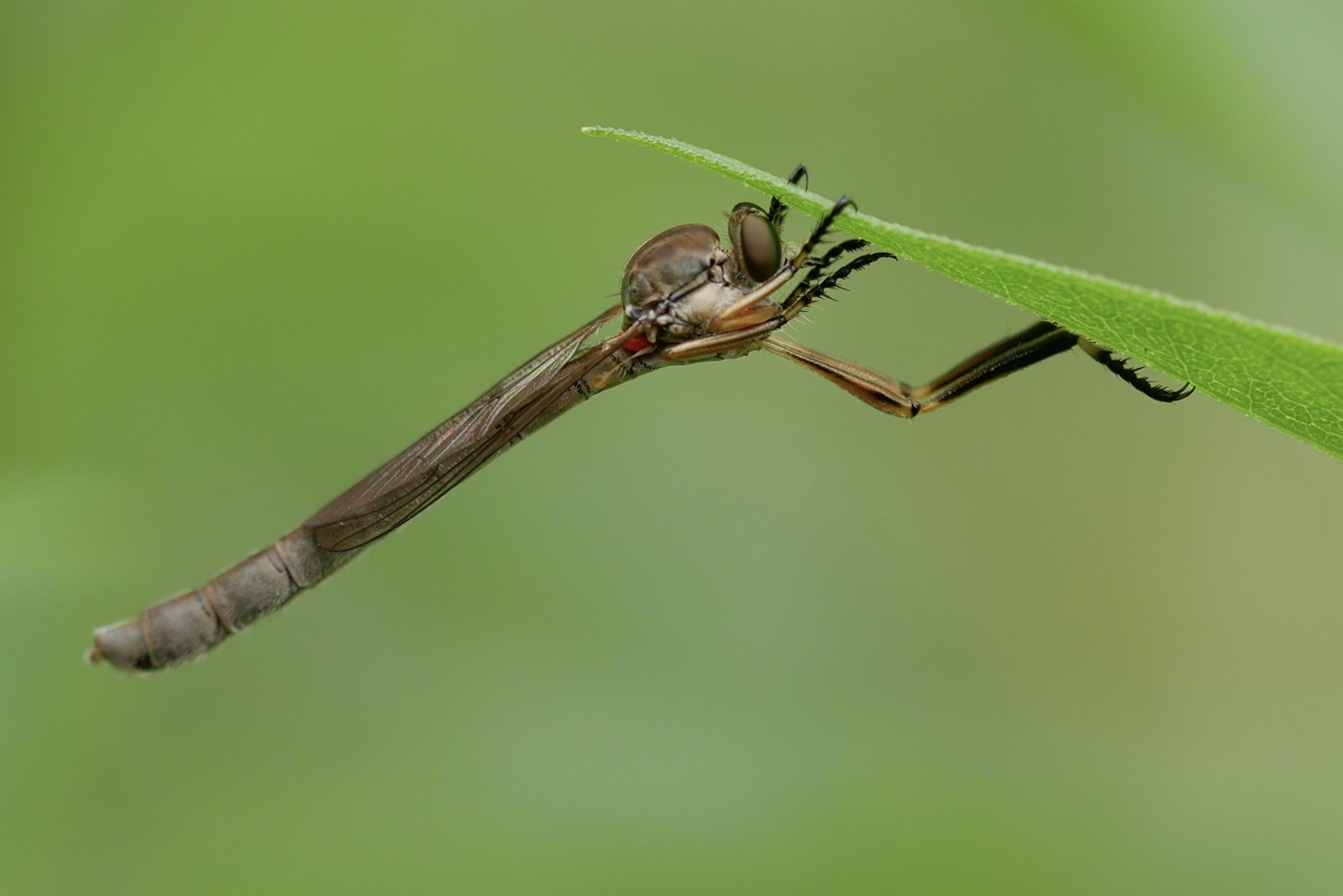 Ähnliche Arten: Wald-Schlankfliege (Leptogaster guttiventris) kleiner, Hinterschenkel mit dunklem Ring. Kleine Schlankfliege (Leptogaster pubicornis) kleiner, Hinterschiene in der Mitte mit dickster Stelle. Die Klöppel-Schlankfliege (Leptogaster subtilis) im Gegensatz zu den anderen Schlankfliegenarten mit gelbem bis gelbbraunem Stechrüssel.