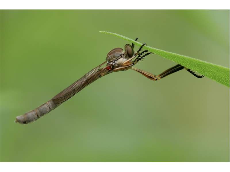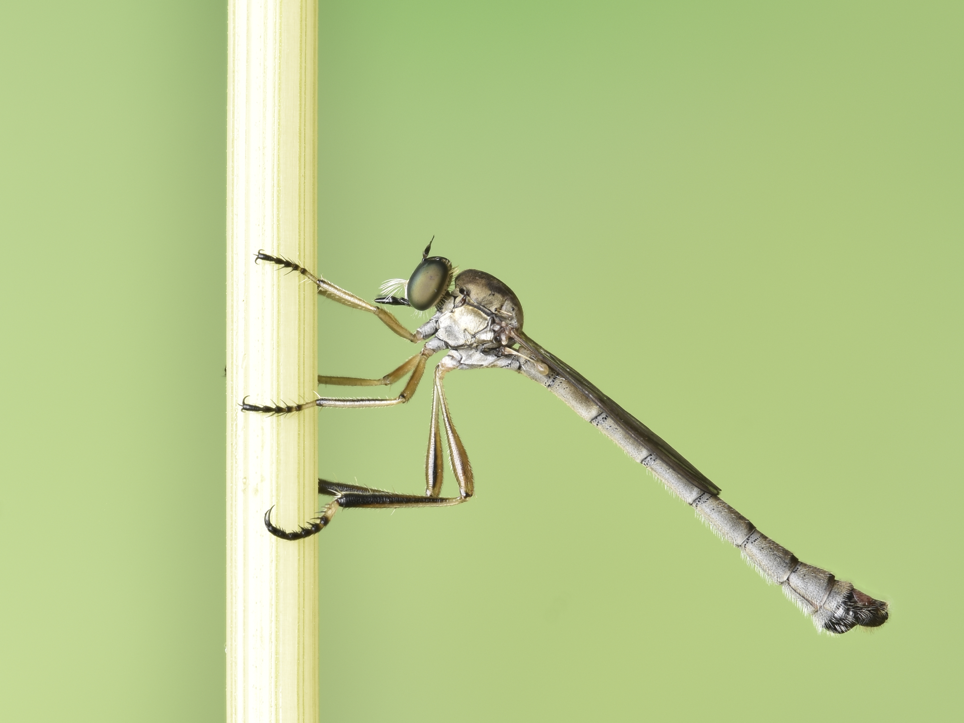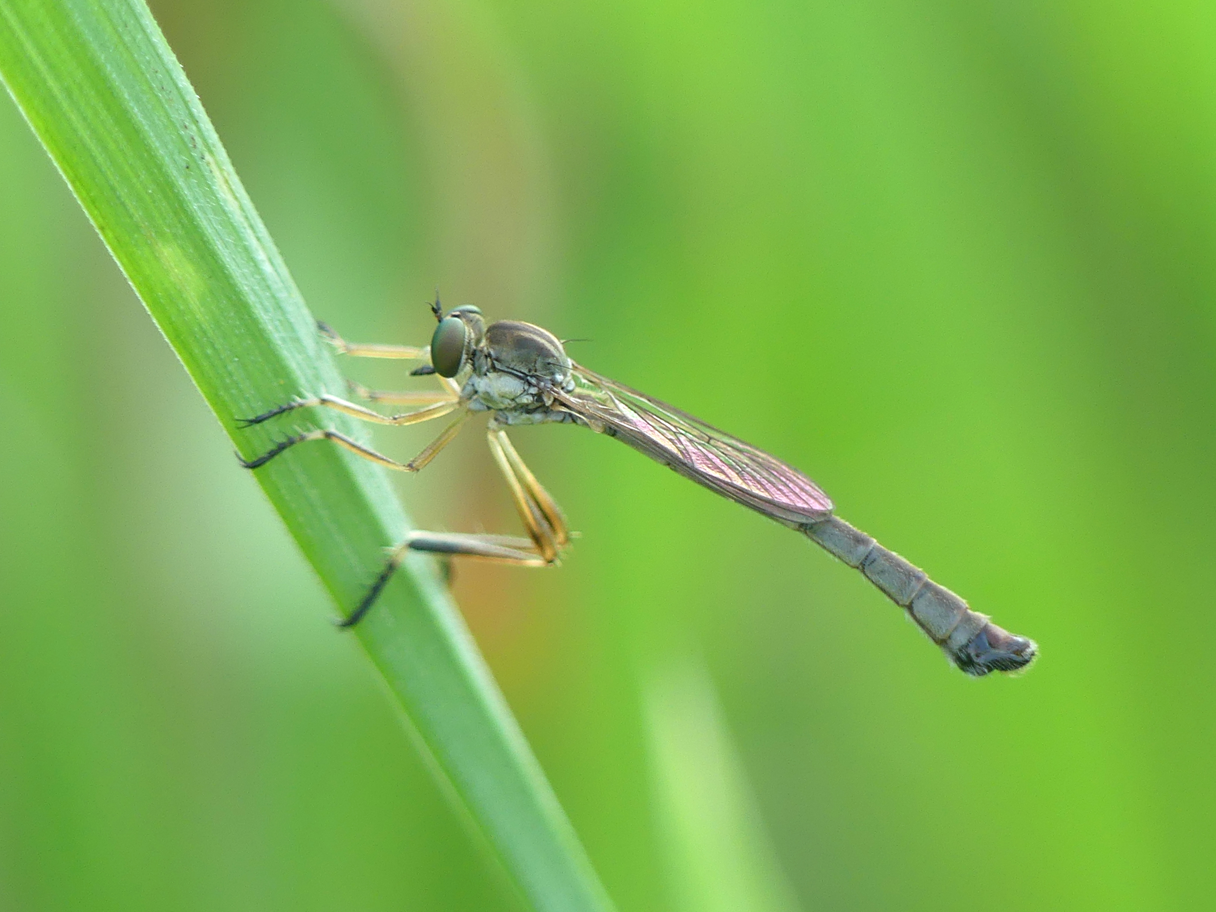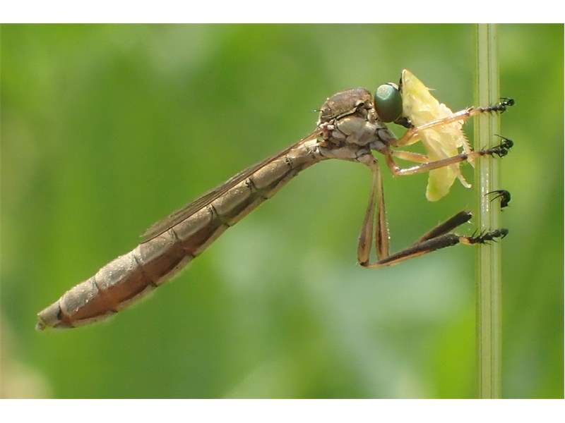 Die Adulten fliegen von Mai bis August. Die Art führt zur Jagd Patroullienflüge in der weniger dichten Krautschicht durch. Zur Ansitzjagd nutzt sie überständige Grashalme oder Blätter. Sie jagt meist sitzende Beute wie Blattläuse, Spinnen und kleine Zikaden. Die Eiablage erfolgt in Sitzposition. Dabei werden die Eier einzeln in die Krautschicht fallengelassen (Melin 1923; Wolff et al. 2018).