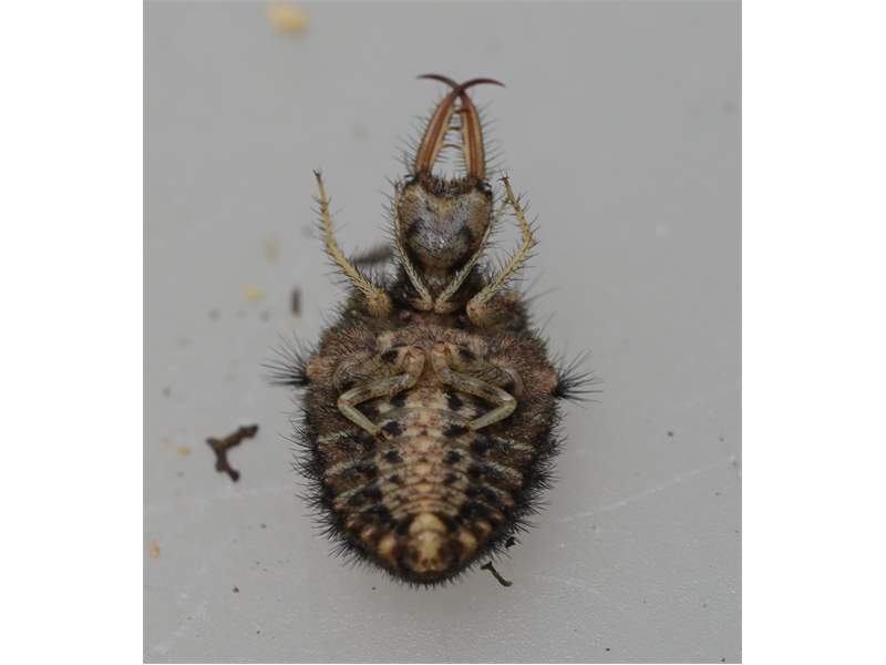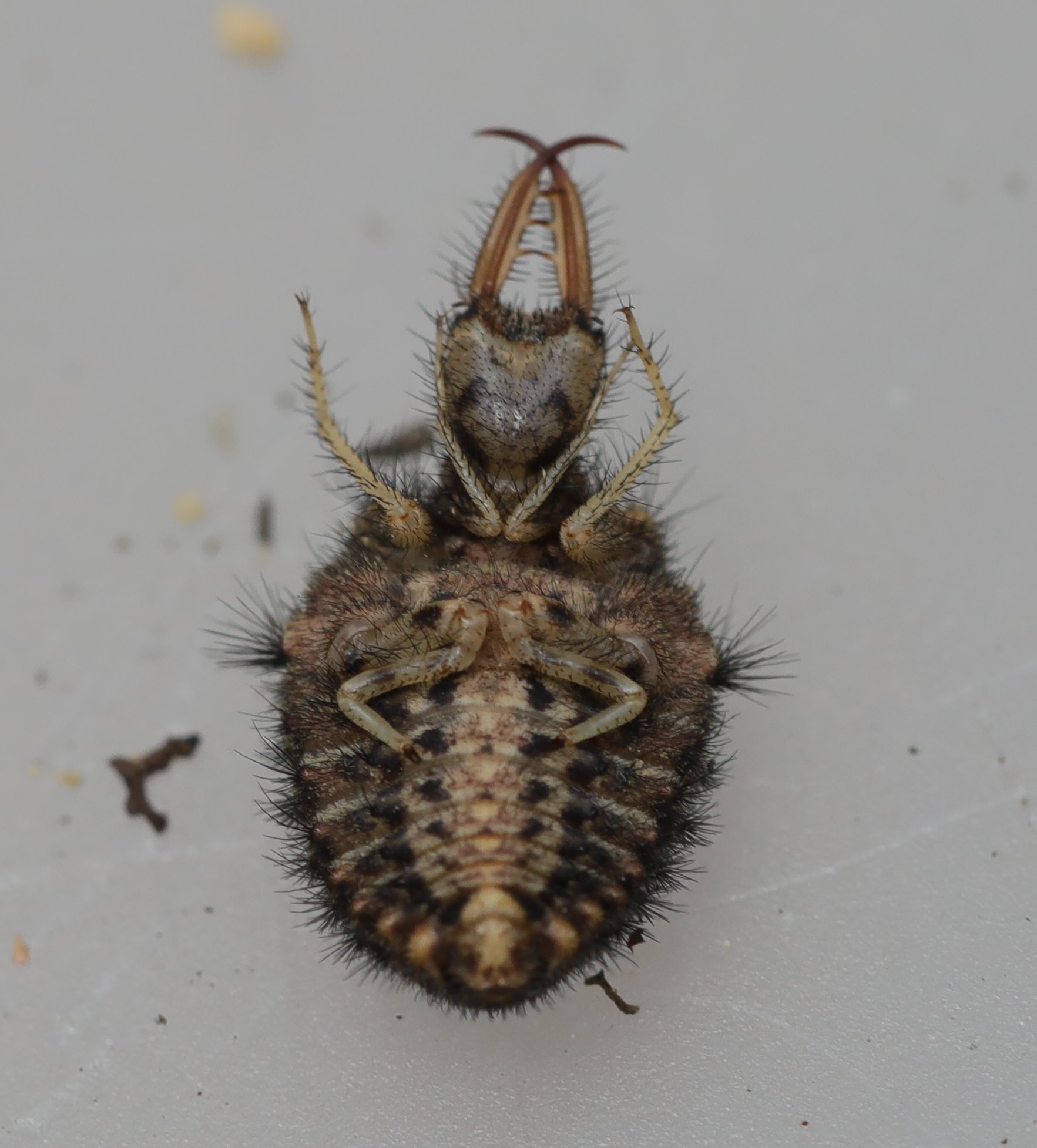 Gemeine Ameisenjungfer (Myrmeleon formicarius Linnaeus, 1767) Dresdner Heide, August 2019, M. formicarius zeigt zwei dunkle Flecken auf den Hinterbeinen der L3-Larven