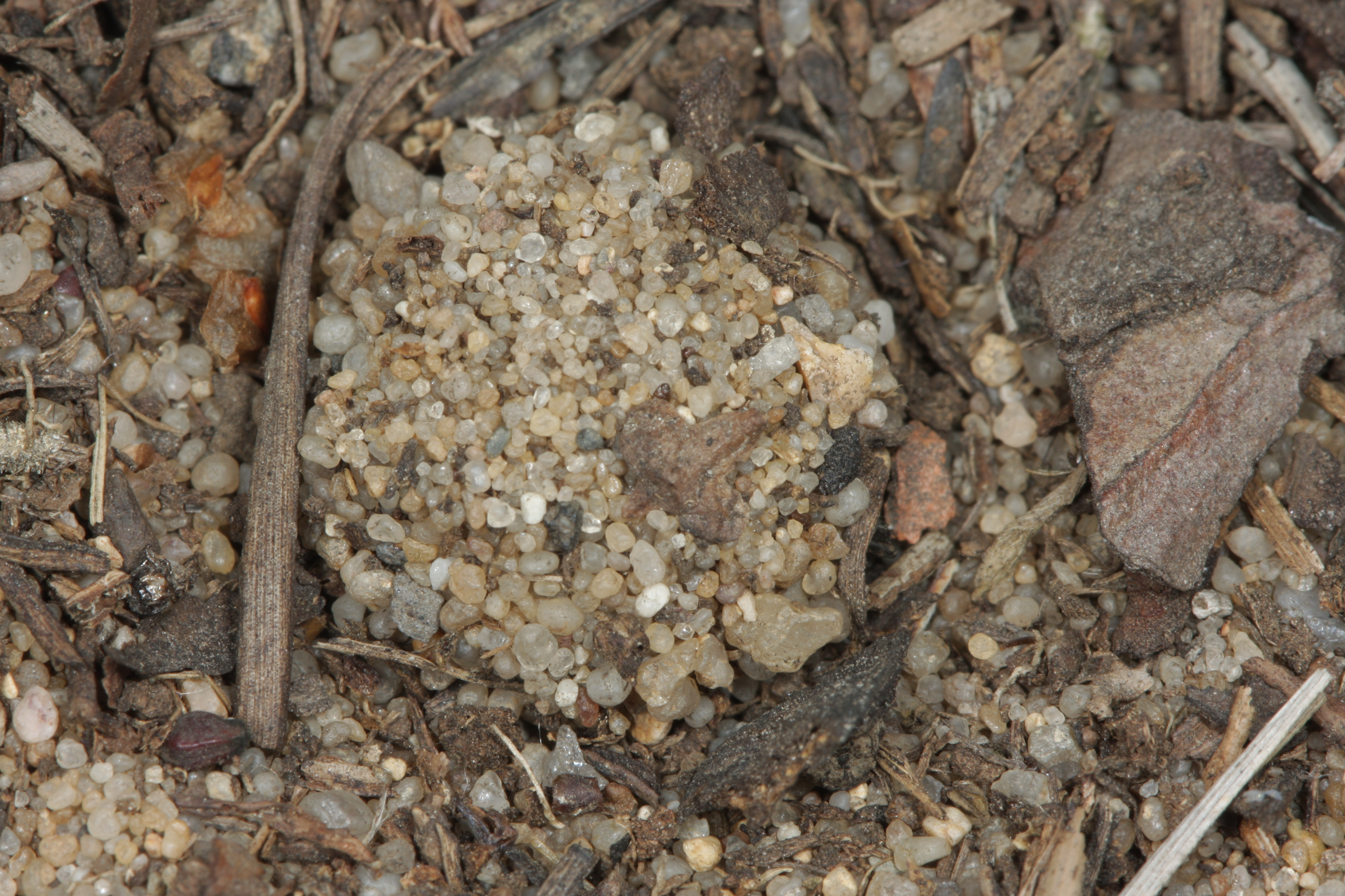 Der Gemeine Ameisenlöwe (Myrmeleon formicarius) verpuppt sich in einer runden Kugel aus feinen Sandkörnchen, wobei das verwendete Material durchaus feiner ist als das durchschnittliche Material der Umgebung. Juni 2015.