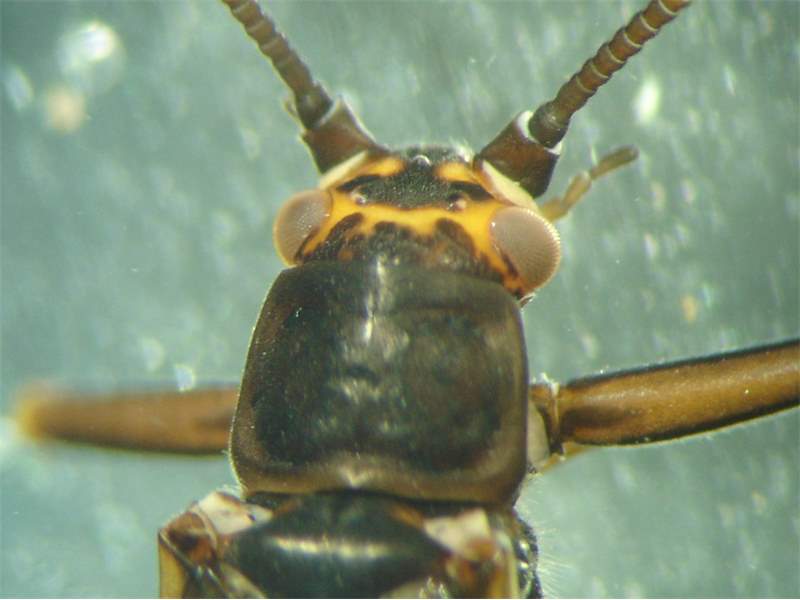 Kopf: dunkelbraun, mit hellerer gelb-oranger Querbinde (manchmal schwer im Gelände erkennbar); Fühlerglieder kurz und breit.