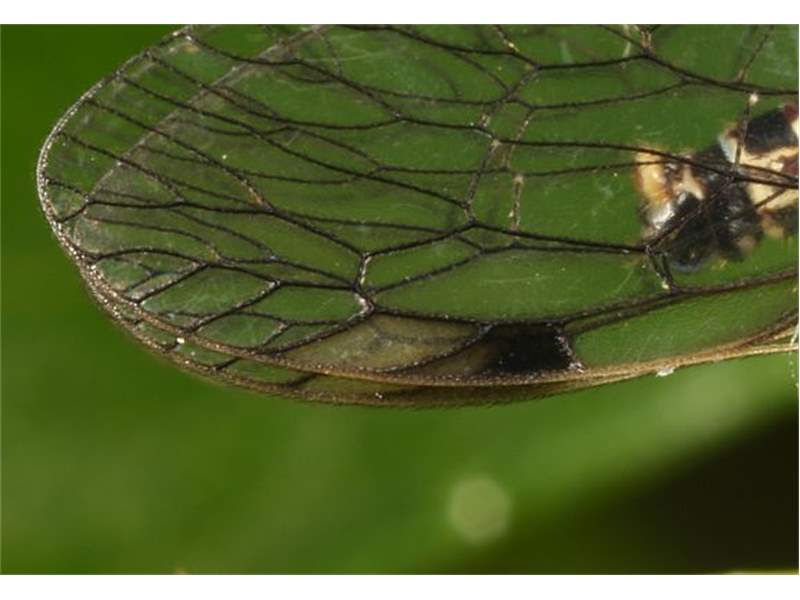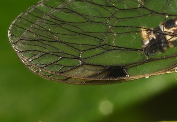 Thorax: Flügelmal (Pterostigma) von einer Ader durchzogen, vorn schwarz, hinten weißgrau.