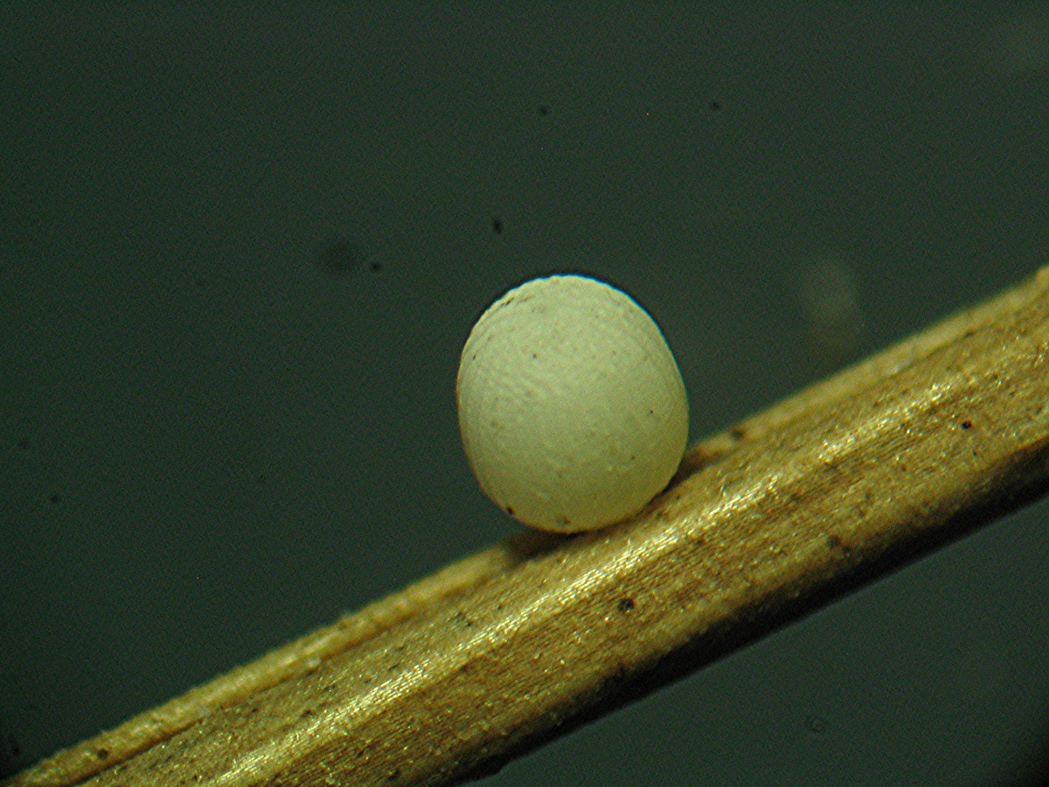 Am 27.8. 2016 legte das Weibchen einer Rostbinde dieses Ei an dürre Grashalme ab. Nochten, 27.08.2016.