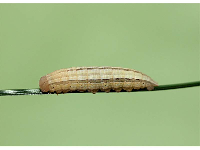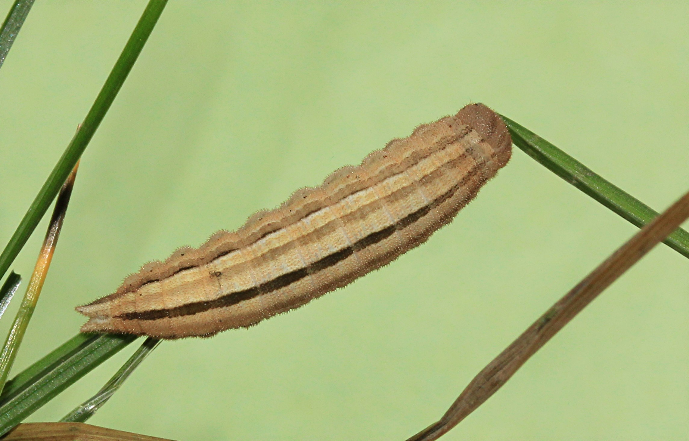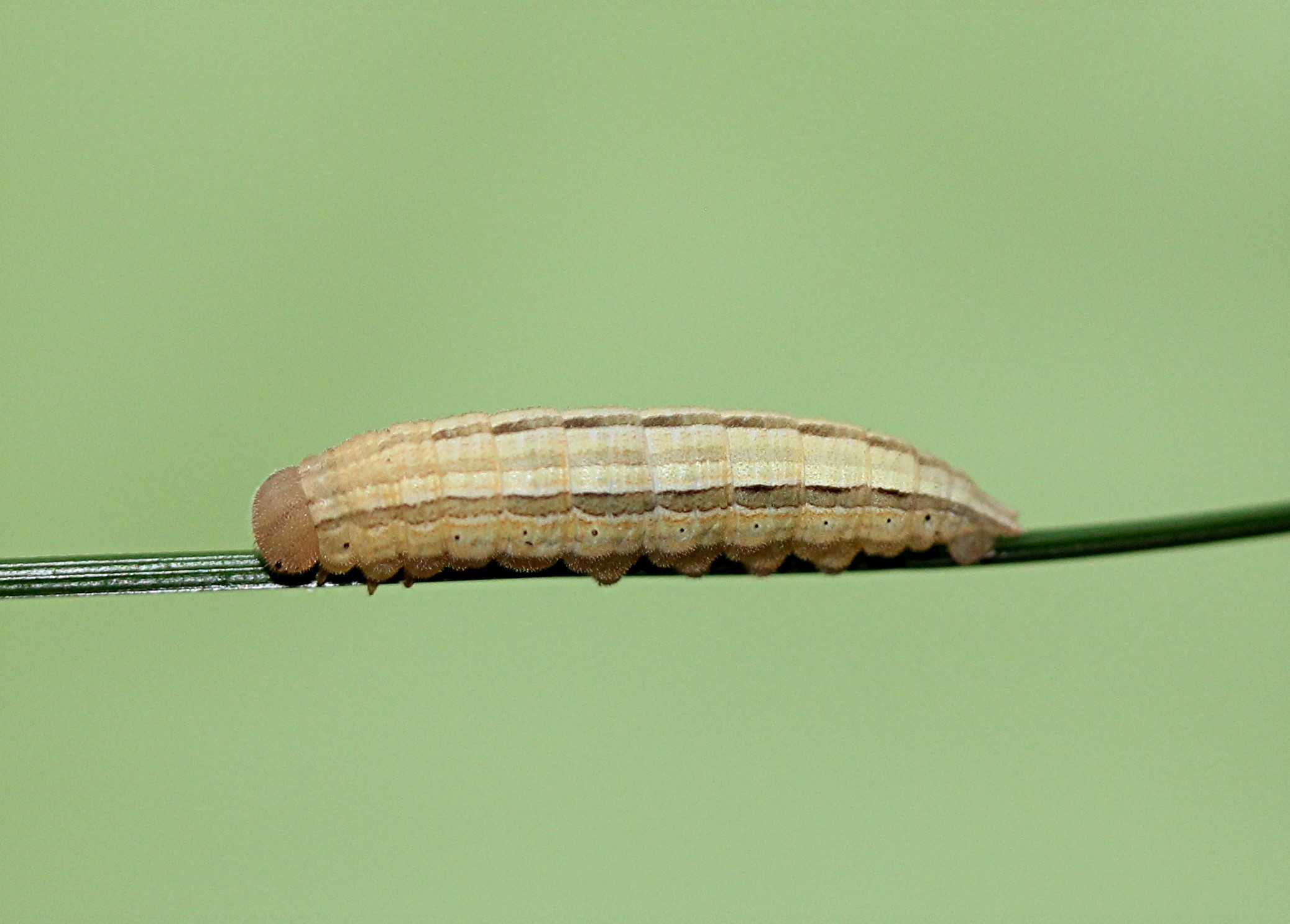 Die weißlichen, deutlich gerippten, tonnenförmigen Eier legen die Weibchen einzeln in der Nähe der Wirtspflanzen der Larven an der Bodenoberfläche oder an abgestorbenen Pflanzenteilen ab. Als Wirtspflanzen gelten deutschlandweit unterschiedliche Süß- und Sauergräser (Poaceae, Cyperaceae) unter anderem Schafschwingel (Festuca ovina agg.), Silbergras (Corynephorus canescens) und die Aufrechte Trespe (Bromus erectus). Nach der Überwinterung und einer intensiven Wachstumsphase im Frühjahr verpuppen sich die nachtaktiven Larven in einem Kokon unter der Erde. Ihre gesamte Entwicklung dauert zwischen 245 und 300 Tagen. Nach der ersten Häutung besitzen die beigebraun gefärbten Larven charakteristische bräunliche Längsstreifen, die ab diesem Zeitpunkt von der Kopfkapsel bis zu dem Analanhang reichen.