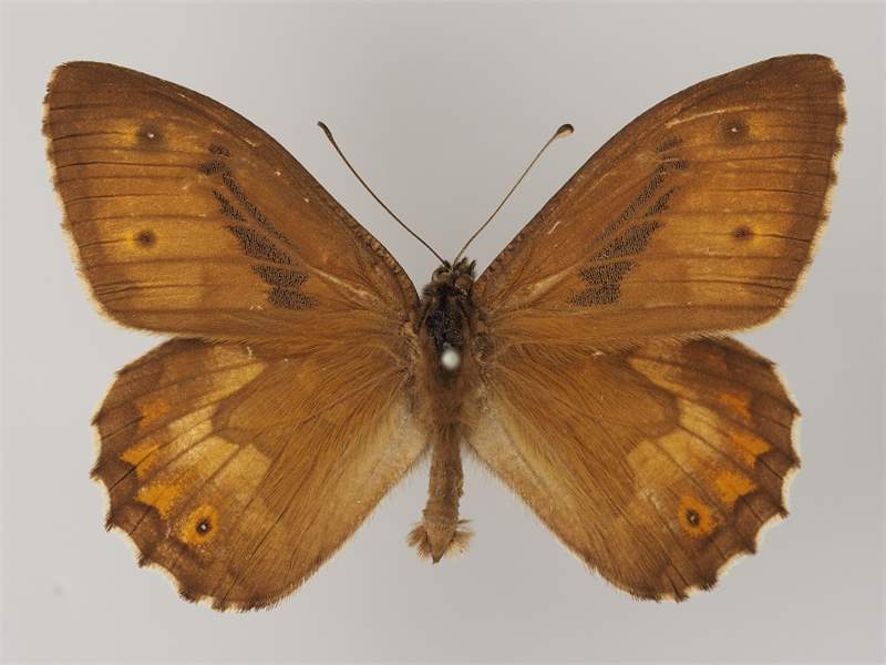 Flügeloberseiten braun, Männchen mit kleinen, undeutlichen Augenflecken und orangen Flecken auf den Hinterflügeln; Weibchen mit hellgelben Flecken und zwei großen, deutlichen Augenflecken im Vorderflügel sowie orangen Flecken im Hinterflügel und dort einem kleinen, aber deutlichen Augenfleck.